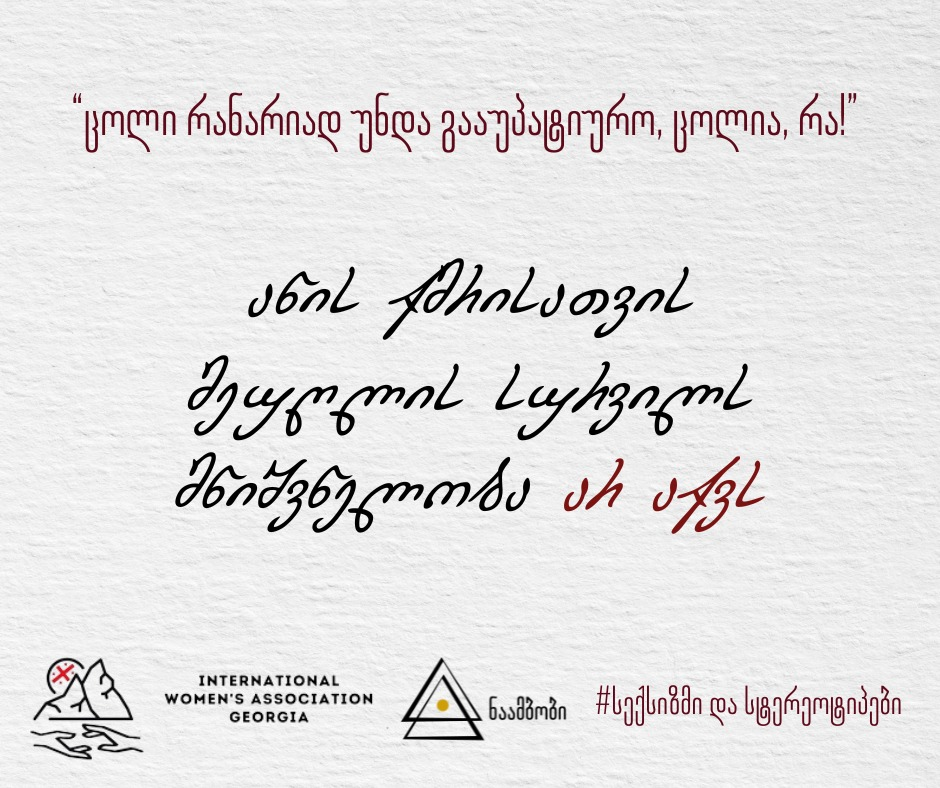“ჩვენ ვაწარმოებთ ონლაინ კამპანიებს, რომლებიც სწორედ ძალადობის ამ ფორმების ამოცნობას უწყობს ხელს, ამჟამინდელი მიმდინარე კამპანია #სექსიზმი და სტერეოტიპები iwa georgia-ს ფინანსური მხარდაჭერით ხორციელდება.