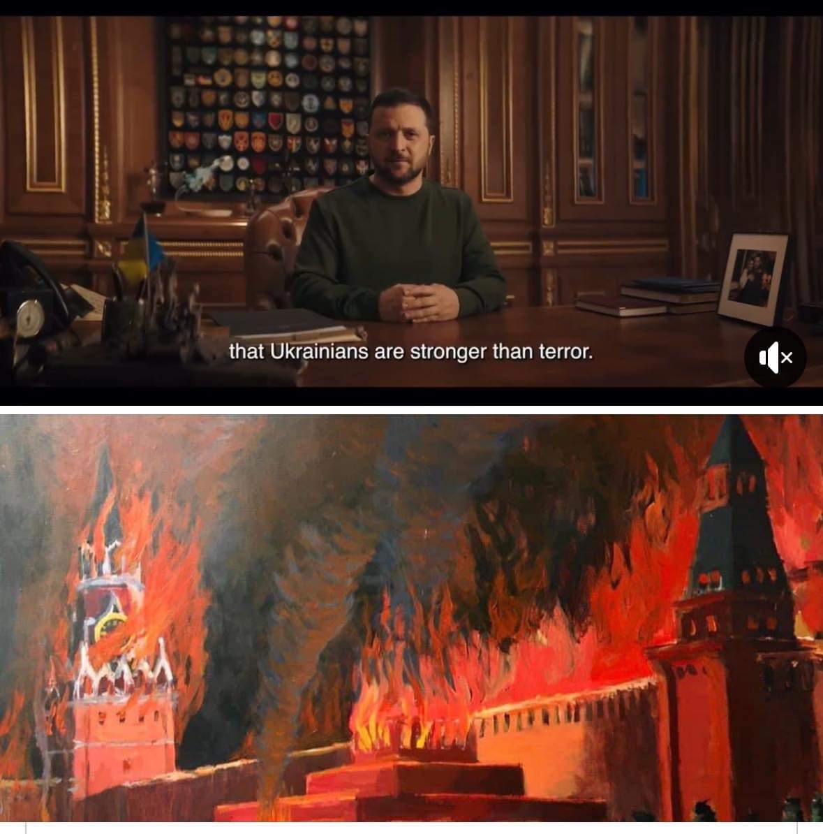 „ჩავრთე ვიდეო და რას ვხედავ… პრეზიდენტ ზელენსკის საახალწლო მიმართვისას, ვიდეოს ბოლოს, კედელზე ჩანს ჩემი ნახატი! ბოლო კადრი სწორედ მასზე ფოკუსირდება და ფონად ზელენსკის სიტყვები ადევს, რომლითაც გამოსვლას ასრულებს: „ვინც ჩვენი ქვეყანა ცეცხლში გახვია, ძალიან მალე თავისი ფანჯრებიდან დაინახავს ასეთივე ცეცხლს“. ზელენსკის გამოსვლა ჩემი ნამუშევრის დიდი კადრით მთავრდება. დაუჯერებელი ამბავია, ამ ნახატს „ოცნება“ დავარქვი, რის ასრულებასაც ვუსურვებ უკრაინას, საქართველოს და ყველა თავისუფლების მოყვარე ადამიანს“.