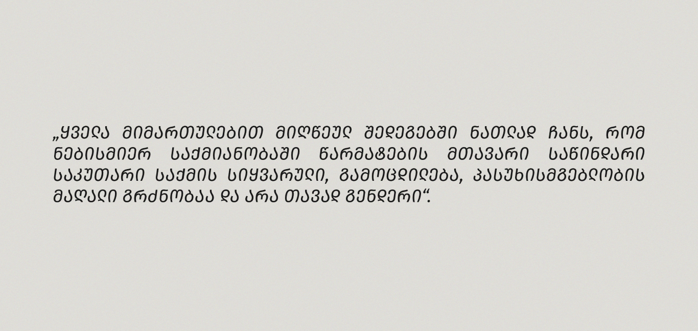 „როცა „თეგეტა ჰოლდინგში“ მივედი, ქალი საბურავებსა და ზეთებში საზოგადოებისთვის – სიახლე, ჩემთვის კი გამოწვევა გახლდათ, რადგან ამ ინდუსტრიაში ძირითადად მამაკაცები იყვნენ დასაქმებული. თუმცა, კომპანია და მასთან ერთად ჩვენ – დასაქმებულები – სწრაფად ვვითარდებოდით და წინ მივიწევდით“.