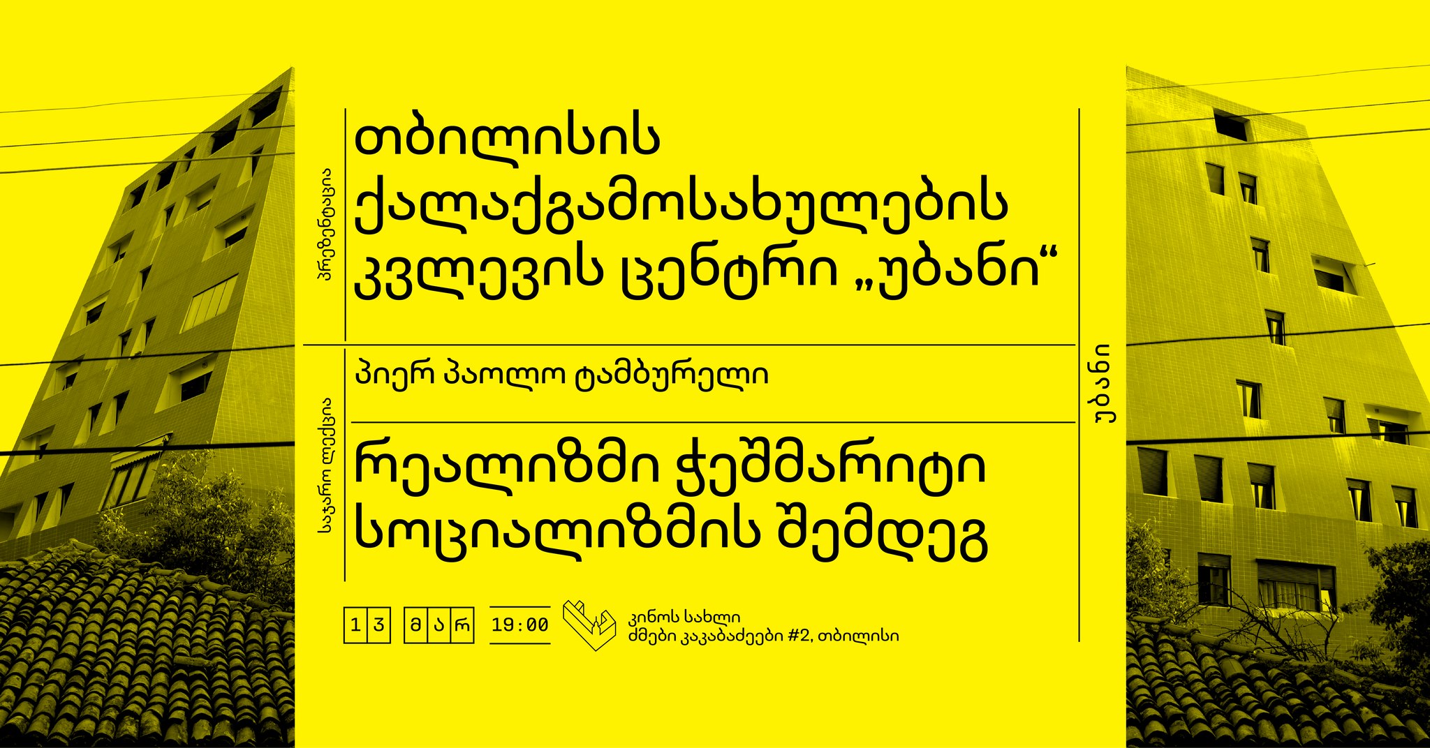 ,,უბანის”  საჯარო პროგრამის პირველი ღონისძიება გაიმართება  2024 წლის 13 მარტს, 19:00, კინოს სახლის შენობაში, ბოლო სართულზე. ასევე, ლექციას წაიკითხავს არქიტექტორი, მკვლევარი და ჟურნალ “San Rocco”-ს თანადამფუძნებელი პიერ პაოლო ტამბურელი თემაზე „რეალიზმი ჭეშმარიტი სოციალიზმის შემდეგ”.