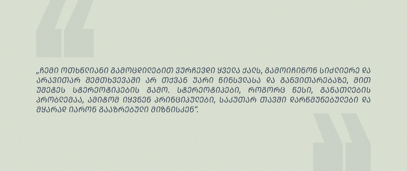 „ვინმე ბიჭს დაუძახე, შენ ვერ გაიგებ, რას ვამბობ…“ – ესმის ასეთი ან მსგავსი წინადადება მისი მისამართით ნათქვამი, ის კი დაჟინებით განაგრძობს სტერეოტიპებით და ავტომობილის პრობლემებით მისული მომხმარებლის დარწმუნებას, რომ, პირველ რიგში, ზუსტად შეუძლია გაიგოს, რა პრობლემა აქვს მის მანქანას და რომ პროფესიას სქესი არ აქვს.