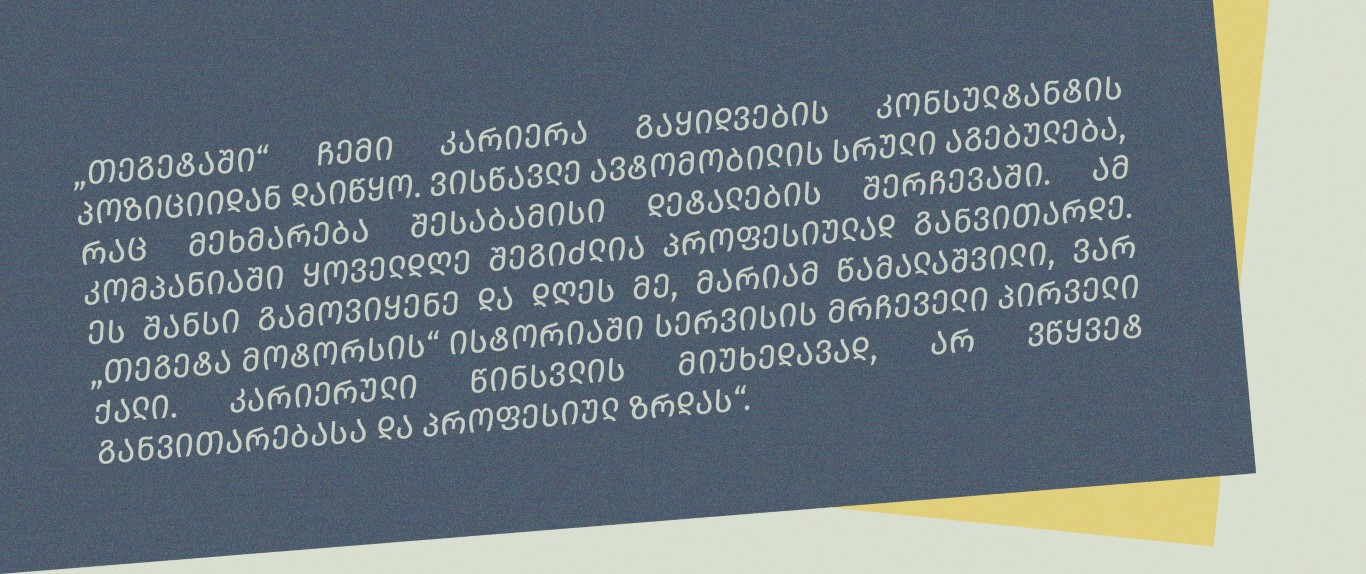კარიერის პირველ ეტაპზე კონსულტანტი ვიყავი საცხებ-საპოხი მასალების მიმართულებით. მახსოვს, პირველმა მომხმარებელმა პირველი კითხვა რომ დამისვა ავტომატური კოლოფის ზეთზე, რომელიც ახალი ნასწავლი მქონდა და ძალიან მომწონდა ეს მიმართულება, იმდენად ამომწურავი პასუხი გავეცი, რომ ჩემი თავით გაკვირვებული დავრჩი. იმ დღის შემდეგ უფრო მეტი მოტივაცია გამიჩნდა, კიდევ უფრო მეტი მესწავლა. მომწონდა, ბევრი რომ ვიცოდი და შემეძლო ამ ცოდნის გაზიარება“.