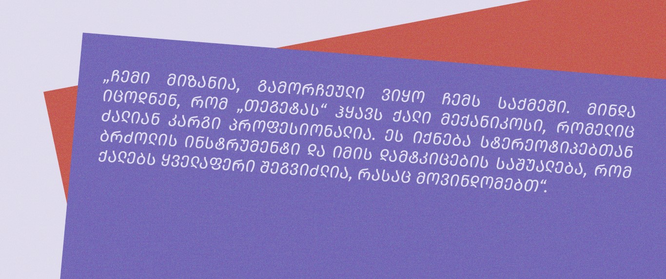 „თეგეტა ჰოლდინგში“ ლიკა მეგობრის რჩევით მივიდა. წლების განმავლობაში ოცნებობდა – ემუშავა იქ, სადაც საქმის კეთებას მშვიდ, სტერეოტიპებისგან თავისუფალ გარემოში შეძლებდა; სადაც გენდერული თანასწორობა პრინციპულად მნიშვნელოვანია. გასაუბრების გავლის შემდეგ მოსწავლე მექანიკოსად აიყვანეს სავალი ნაწილის მიმართულებით. დღეს უფროსი მექანიკოსია და სამუხრუჭე სისტემაზე მუშაობს.