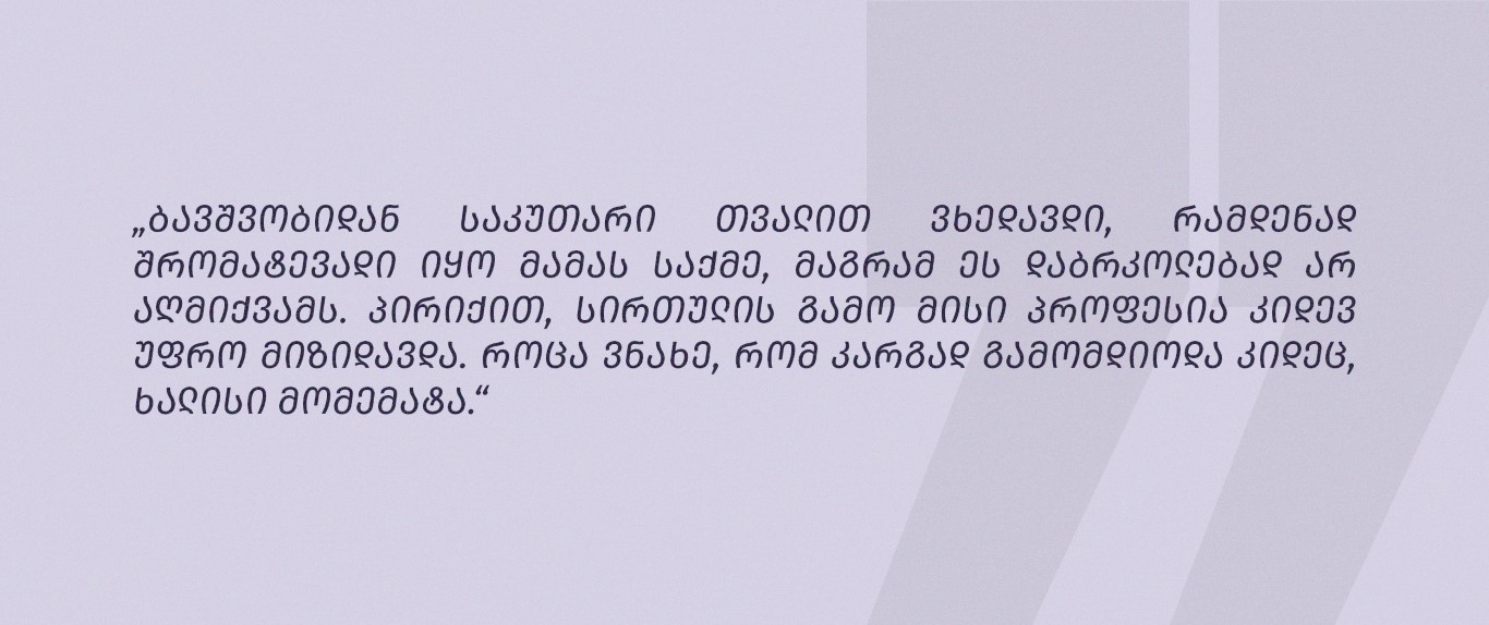 „ნამდვილად რთული საქმეა, მაგრამ, თუ ამის კეთება მთელი გულით გინდა, თავისუფლად შესაძლებელია, რომ სირთულეები გამოწვევებად აქციო და მათი დაძლევით სიამოვნება მიიღო. მომხმარებლების ღიმილიანი, კმაყოფილი და ცოტათი გაოცებული სახეები კიდევ უფრო მიძლიერებს მოტივაციას“.