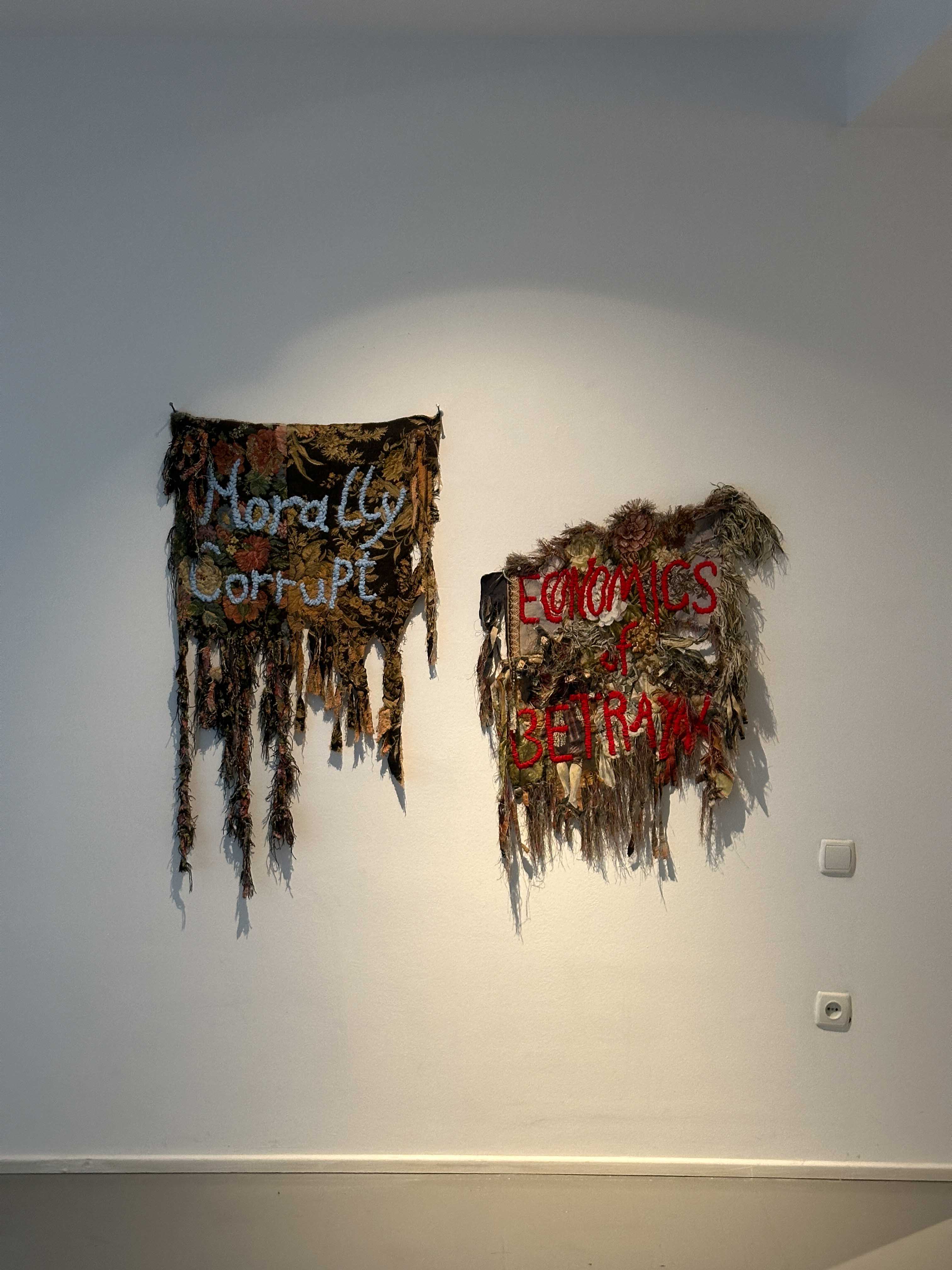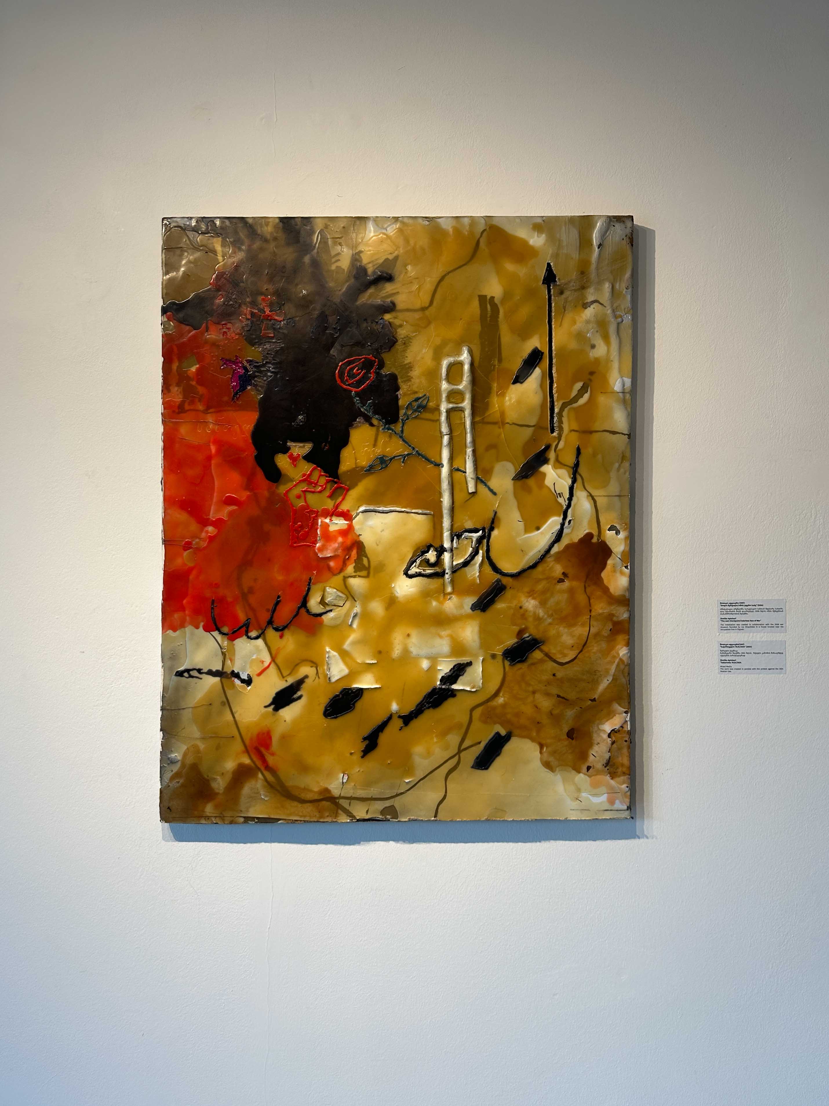 ისე როგორც ყველაფერი სამყაროში, ხელოვნებაც პოლიტიკურია. ეს გამოფენაც მკაფიოდ სახალხო, ეროვნული ნარატივის გამტარია და მიხარია, რომ ჩემი ნამუშევარიცაა ერთ-ერთი ხელოვანების ამ პოლიფონიაში. 2020 წელს შექმნილი ნამუშევარი “მოკლე ისტორიული მეხსიერება“, ძველ, სამფეროვან დროშაში სპეციალურად დაშვებულ შეცდომაზეა აგებული. ეს დროშა რამდენიმე წლის წინ შეიცვალა, მაგრამ დამთვალიერებლის 95% ვერ ამჩნევს შეცდომას ნამუშევარში. ეს მცირე, მაგრამ მკაფიო შეცდომა ქვეყნის მთავარ სიმბოლოში დასაშვებს ხდის, რომ არ გვახსოვდეს უახლოესი ისტორიული ფაქტებიც და ეს ბადებს ბუნებრივ განცდას, რომ იგივე შეცდომებს ვუშვებთ, წინ ვერ მივდივართ, ვიტკეპნებით, ცრემლებიც ამიტომაა ნამუშევარზე.”