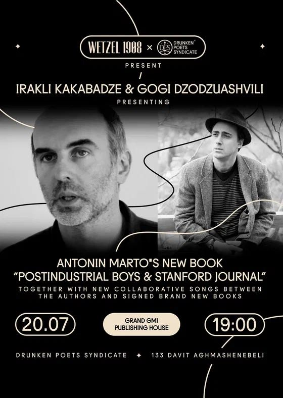სწორედ „მთვრალი პოეტების სინდიკატში“, ფიროსმანის „თავადების ქეიფით“ ინსპირირებული მოზაიკის ფონზე, გაიმართა პოეტის, დრამატურგის და თანამედროვე პერფორმანსში გაწაფული არტისტის, ირაკლი კაკაბაძის (მისი არტისტული ფსევდონიმია ანტონინ მარტო) წიგნის – PostiIndustrial Boys-ის პრეზენტაცია.