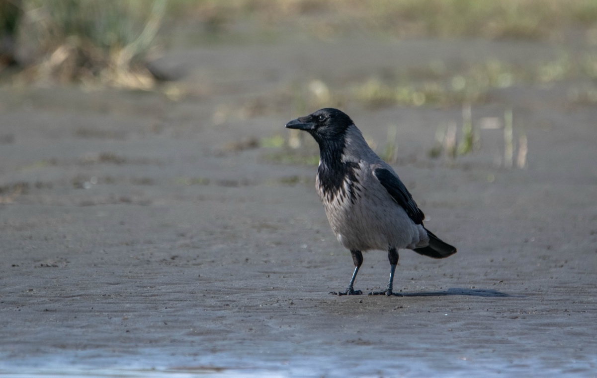 აქვს რუხი ფერის სხეული, შავი ფერის თავი და ფრთები. კუდი მასიური, მოგრძო, შავი შეფერილობის ნისკარტი, მკერდზე ჩამოუდის შავი ლაქა. გვხვდება წყლის პირას, ტბების ირგვლივ.