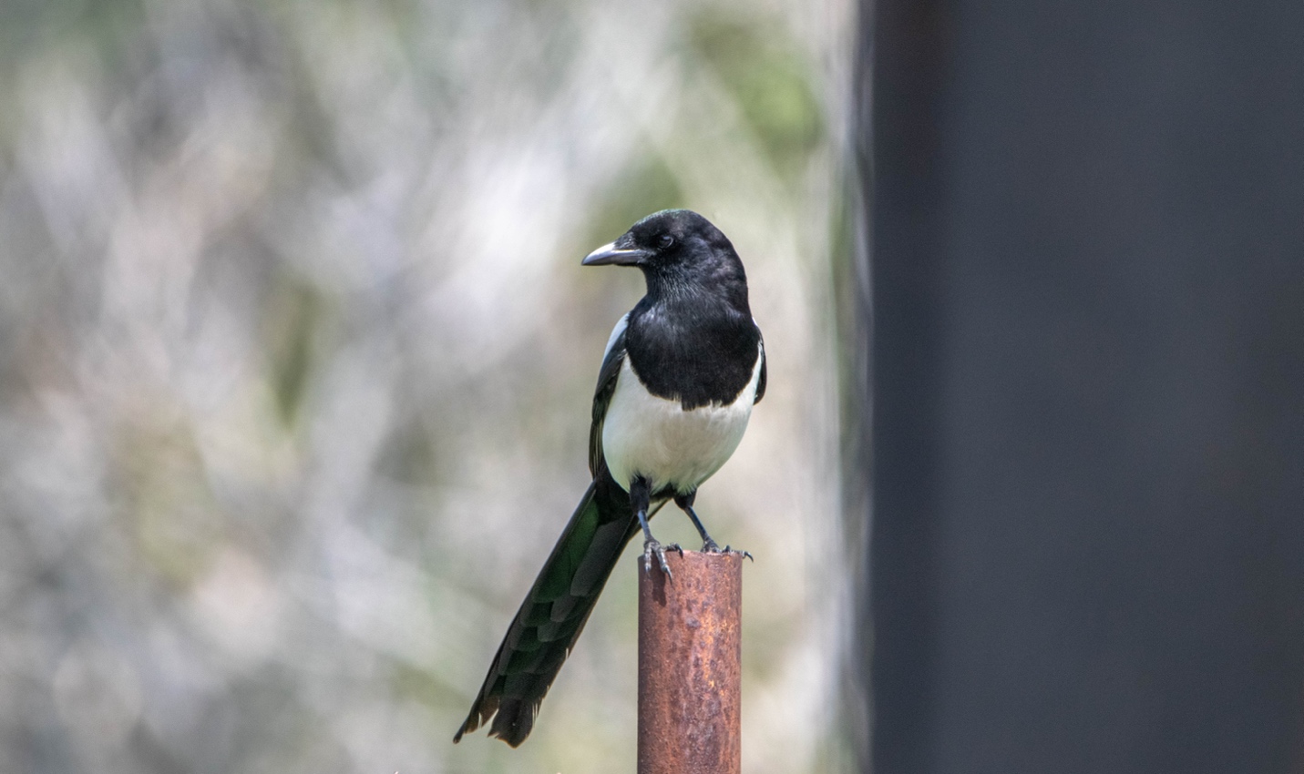 ადვილად გამოსაცნობია გრძელი კუდითა და შავ-თეთრი შეფერილობით. აქვს თეთრი მუცელი და გვერდები, შავი ფრთების ბოლოებზე გადაჰკრავს ლურჯი ფერი. გრძელ კუდზე გასდევს მომწვანო ფერი.იკვებება მცენარეული და ასევე ცხოველური წარმოშობის საკვებით, მინდვრის თაგვებით, ხშირად ჭამს სხვა ფრინველების კვერცხებს. კარგად ეგუება ადამიანების ახლოს ცხოვრებას. ხშირად გვხვდება სკვერებსა და ბაღებში.