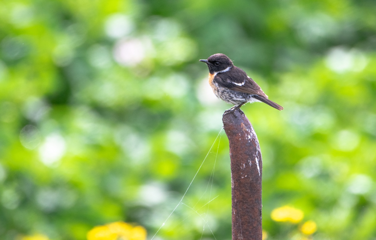 აქვს მოკლე კუდი და გრძელი ფეხები. ზრდასრული მამრის თავი შავი ფერისაა, გვერდებზე აქვს თეთრი საყელო, რომელიც ნახევარ რგოლს ქმნის კისრის გარშემო.წითელი-მოყვითალო მკერდი მუცლის მიმართულებით ღიავდება. კუდქვეშა ბუმბული თეთრია. იკვებება მწერებით და კენკრით.გვხვდება ბაღებსა და სკვერებში.