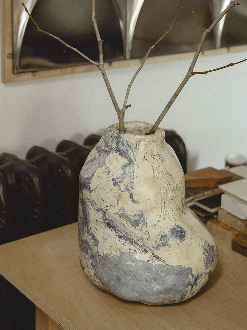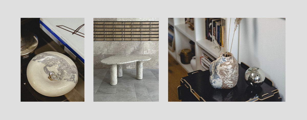 საბოლოო შედეგი იძენს სიმძიმეს და მასიურობას, რაც ნივთს განსაკუთრებულ ხასიათს სძენს. დამზადების პროცესი მოიცავს რამდენიმე ეტაპს — მასალის შეზავებას, ფორმის მიცემას, მექანიკურ დამუშავებას და საბოლოო მოპირკეთებას ხელით. სწორედ ეს უნიკალური ტექნოლოგია განასხვავებს Haeri-ს ნამუშევრებს და ანიჭებს მათ გამორჩეულ ტაქტილურ და ვიზუალურ იდენტობას.