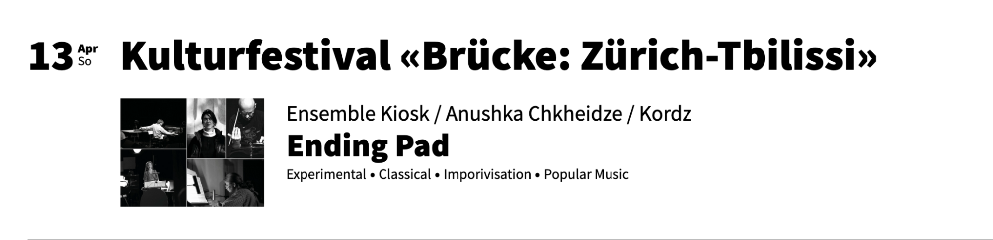 Kordz: “თანამედროვე ქართული კულტურის ფესტივალი “ხიდი: ციურიხი-თბილისი” 13 აპრილს დაიხურა ჩვენი კონცერტით – „Ending Pad“ კლუბში Moods Tamriko Kordzaia Russudan Meipariani Anushka Chkheidze / Halfie KioskEnsemble