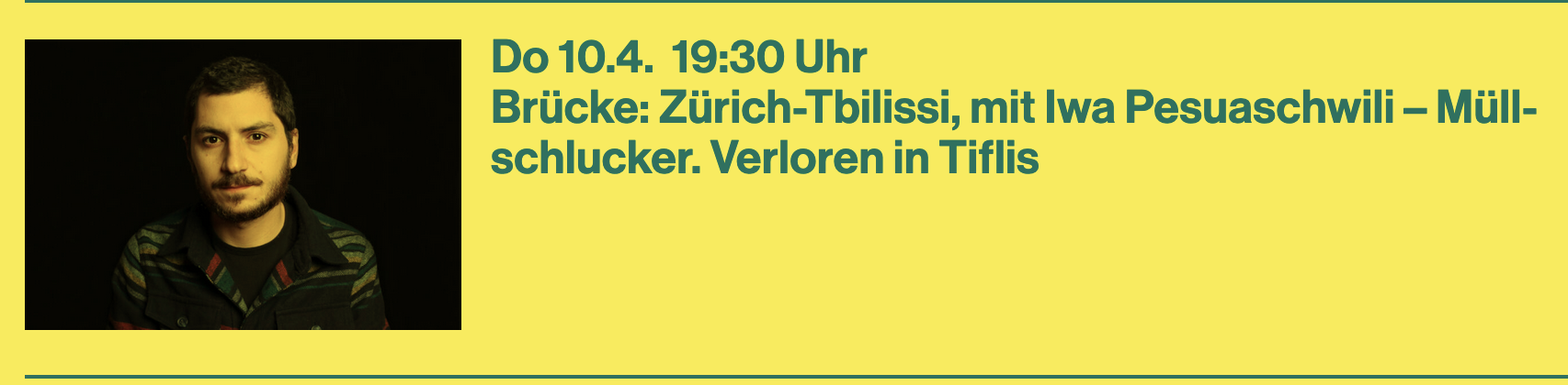 10 აპრილს, ციურიხი ლიტერატურის სახლში, მწერალთან, ივა ფეზუაშვილთან და მთარგმნელთან, ნათია მიქელაძე-ბახსოლიანთან ერთად კითხვა და დისკუსია გაიმართა. ივა ფეზუაშვილის რომანი – “ბუნკერი“ 2024 წლის სექტემბერში ითარგმნა და გერმანულ ენაზე გამოიცა. რომანის წარდგენა შვეიცარიაში პირველად მოხდა.