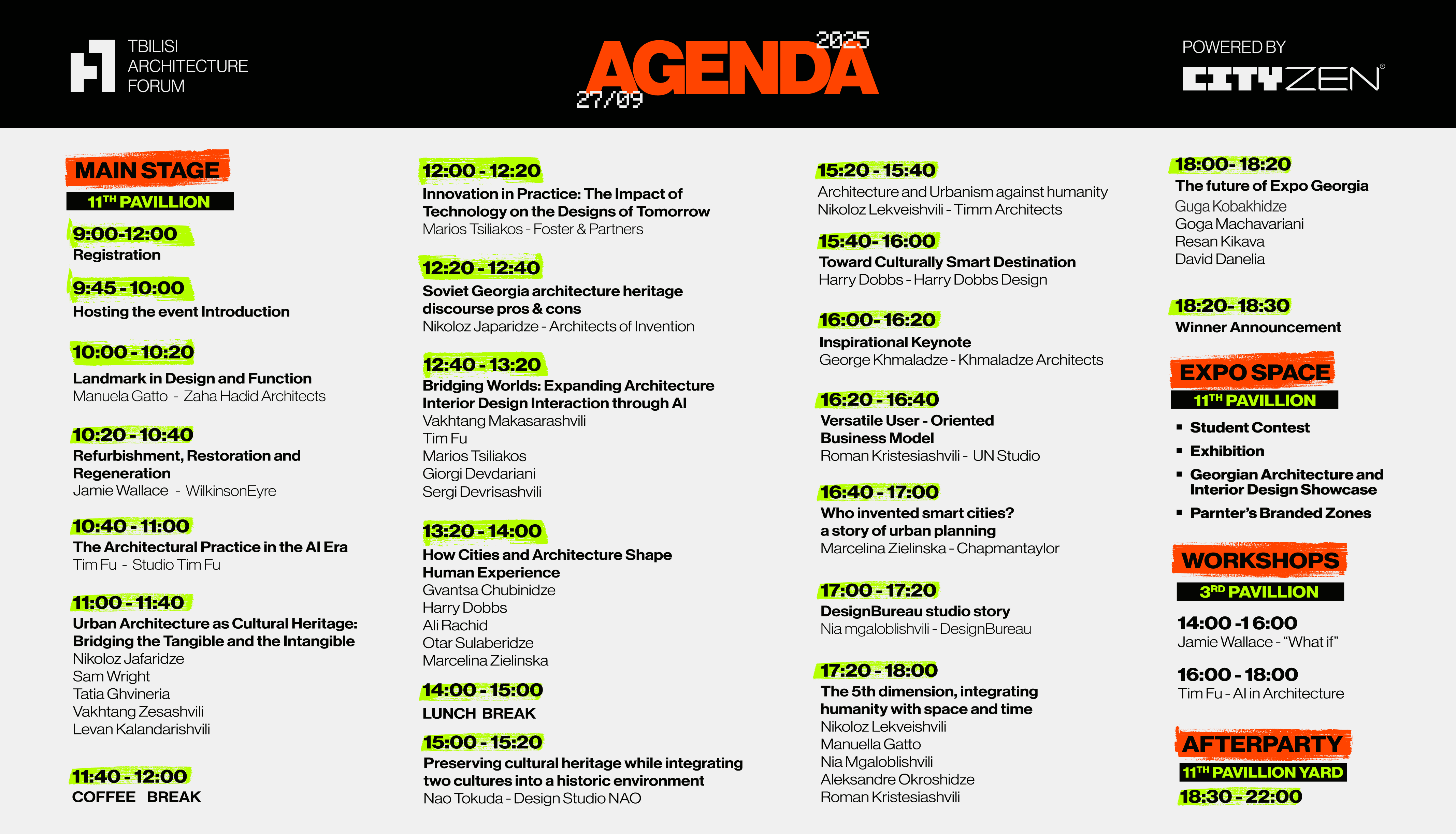 ფორუმის დღის წესრიგი უკვე ხელმისაწვდომია, და ექსკლუზიურ ვორქშოფებზე რეგისტრაცია ოფიციალურად გაიხსნა. მონაწილეებს შეუძლიათ დაიცვან ადგილი პრაქტიკული და ინტერაქციული სესიებისთვის, რომლებიც მიზნად ისახავს არქიტექტურის, დიზაინისა და ურბანული ინოვაციის მომავლის კვლევას.