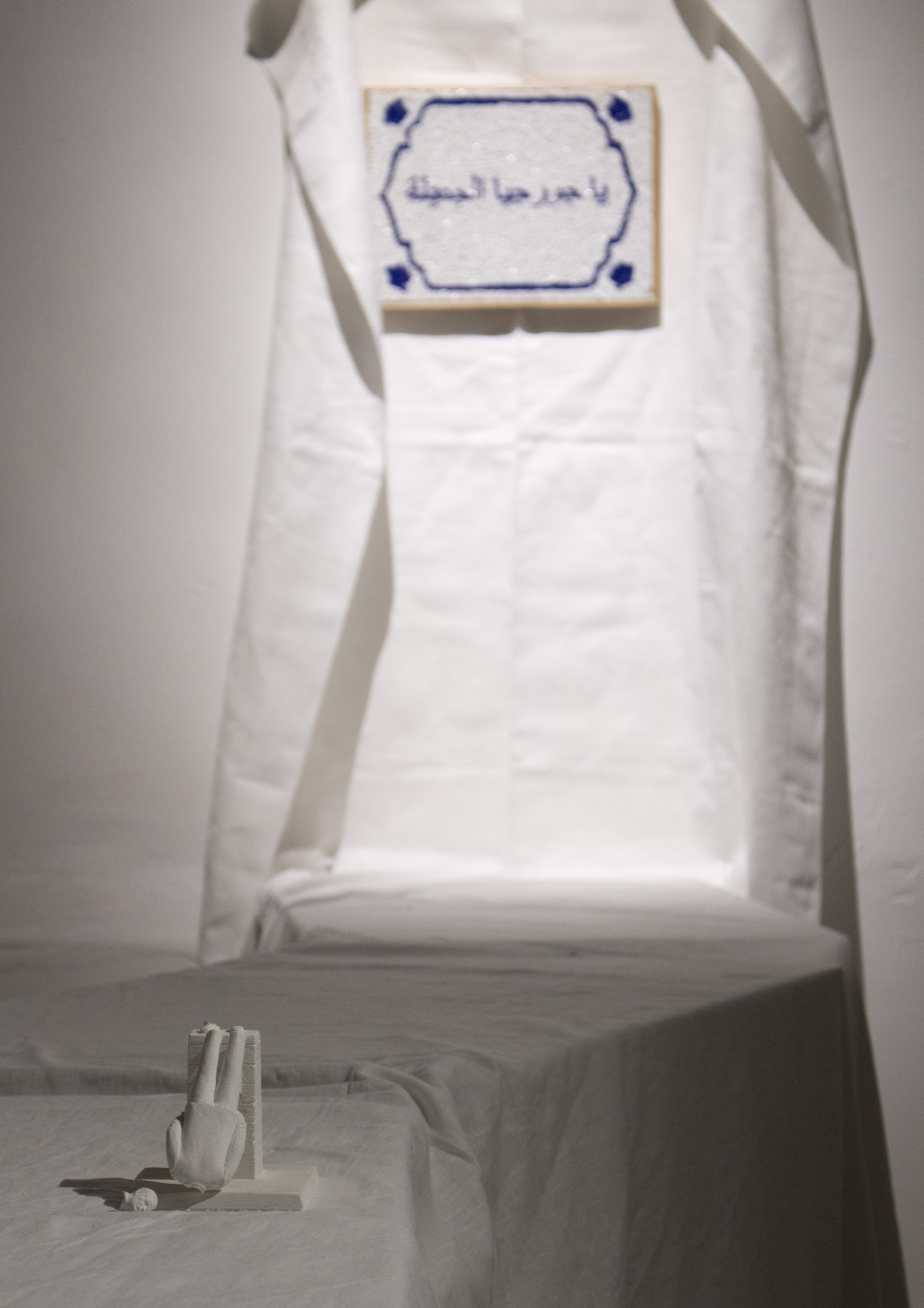 სამშობლოს, იდენტობისა და მეხსიერების დანაკარგებზე ყვება თემო ქართლელიშვილის მოზაიკაც. ნამუშევრის ტექსტი მუჰაჯირებზე, კავკასიიდან გადასახლებულ მუსულმანებსა და საქართველოდან ფერეიდანში გადასახლებულ ქართველებზე გვიყვება. თეთრ ფონზე ცისფერი, ლამაზი არაბული ასოებით გამოყვანილმა წარწერამ, მეც მაშინვე ფერეიდნელი ქართველები გამახსენა. უფრო ზუსტად კი, ის ფაქტი, როგორ ქარგავდნენ ასწლეულების განმავლობაში აკრძალულ ქართულ ასოებს სუფრებზე და საყოფაცხოვრებო ტექსტილზე ისე, თითქოს ორნამენტები იყო. რომ ფერეიდნელს არ დავიწყებოდა, უცხოს კი ვერ ამოეცნო მათში ქართული ანბანი.